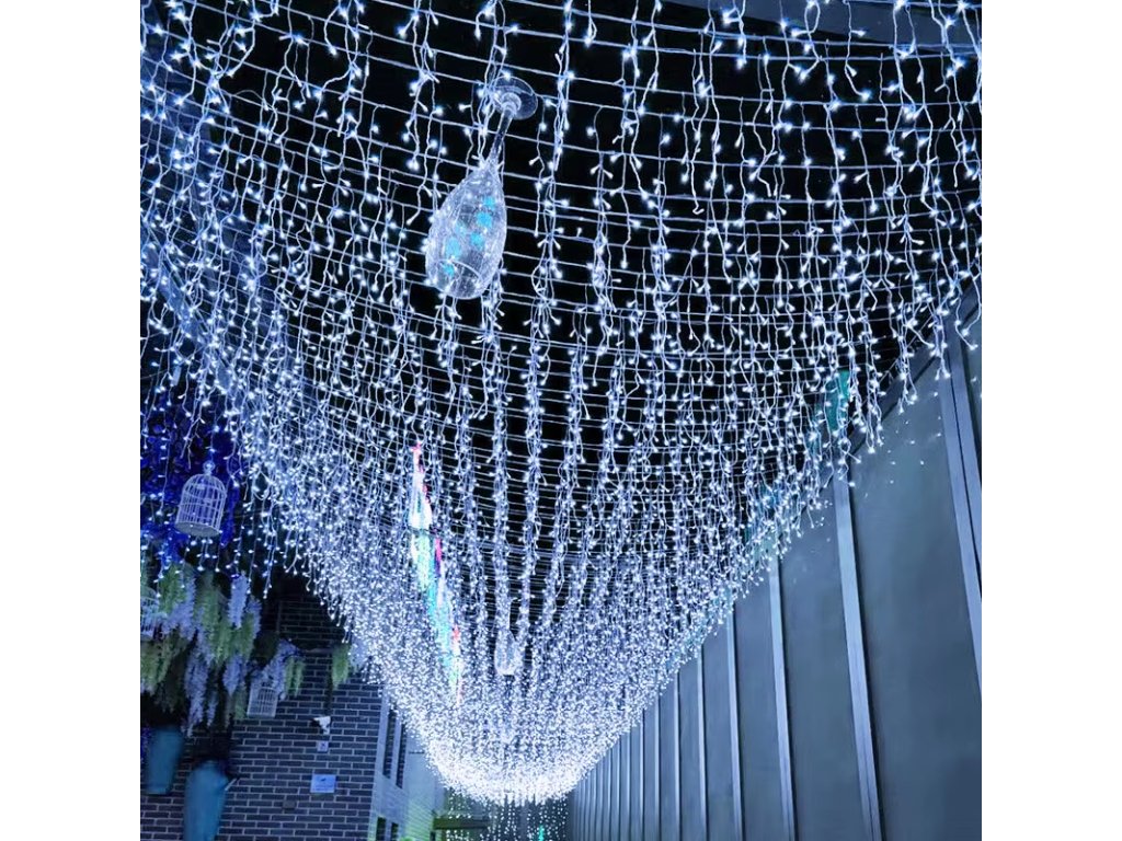✅Záclona má dĺžku 14,5 metra, pričom rôzne dĺžky svetelných prameňov (3-5-7-5 diód) vytvárajú efekt prirodzene usporiadaných ľadových cencúľov. Studený biely odtieň svetla krásne zvýrazní architektúru budovy.