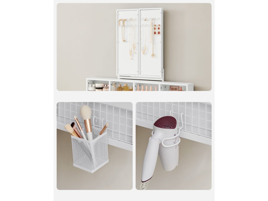 Vďaka širokému blatu a 3 priestranným zásuvkám si doňho uložíš všetko – od make-upu, cez pleťovú kozmetiku až po pomôcky na gélové nechty. Zrkadlo je uzatvárateľné, takže sa nemusíš obávať prachu, a navyše na jeho bočných dvierkach nájdeš háčiky na náhrdelníky – praktické a štýlové riešenie v jednom.