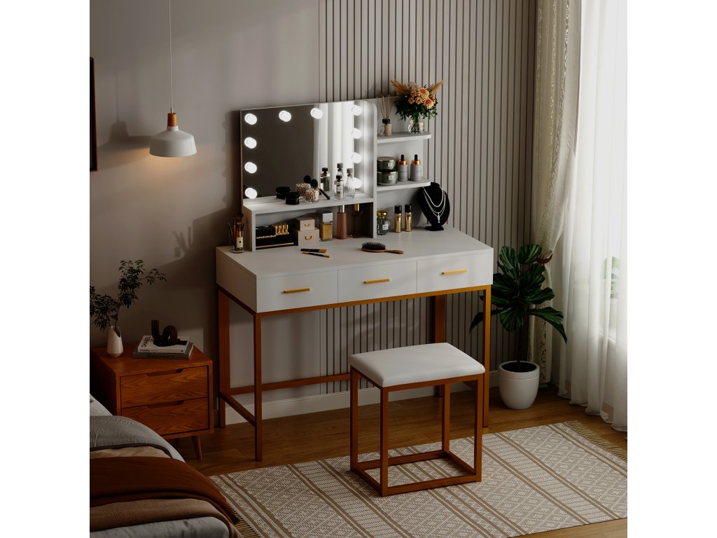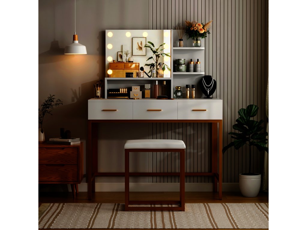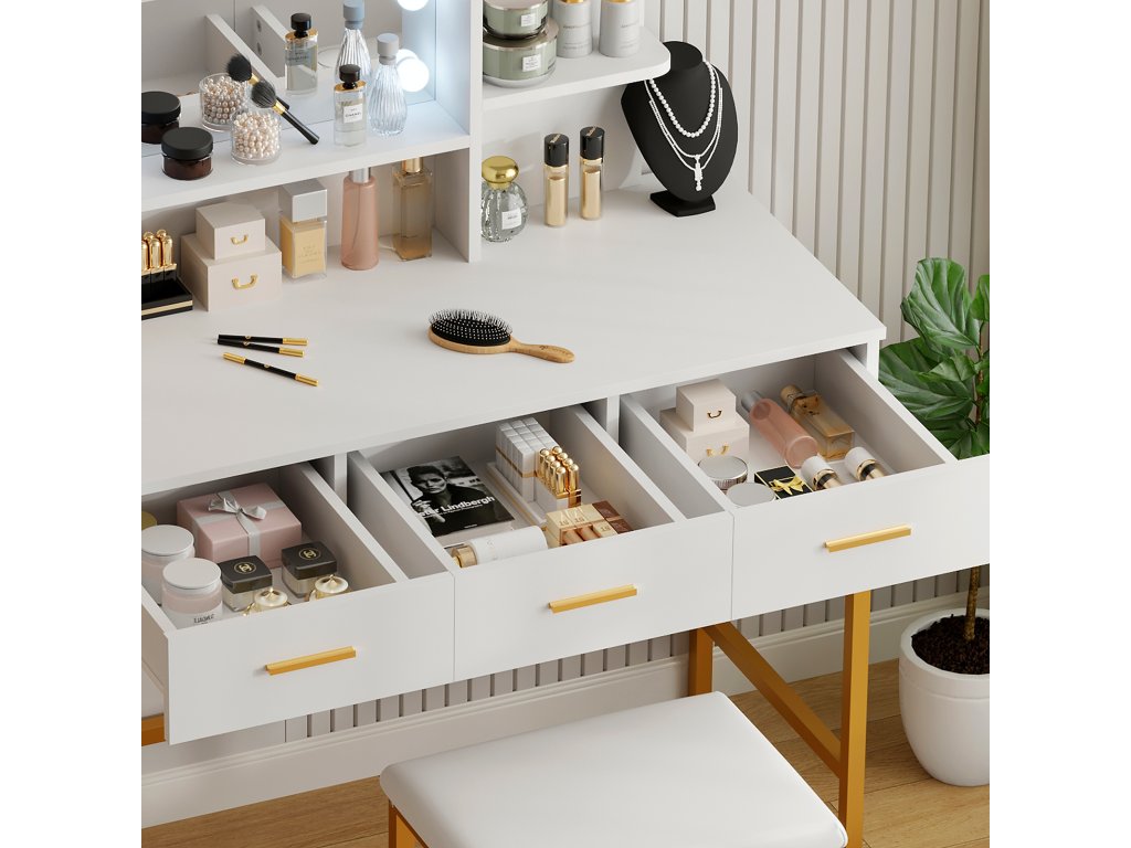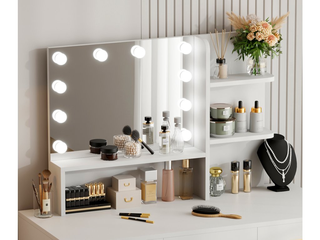 Spojenie elegancie, praktickosti a pohodlia. Tento moderný toaletný stolík s LED zrkadlom a taburetom je navrhnutý tak, aby sa stal neoddeliteľnou súčasťou tvojej spálne či šatníka. Vďaka premyslenému dizajnu ponúka dostatok úložného priestoru, osvetlenie pre dokonalé líčenie a komfort pri každodennom používaní.