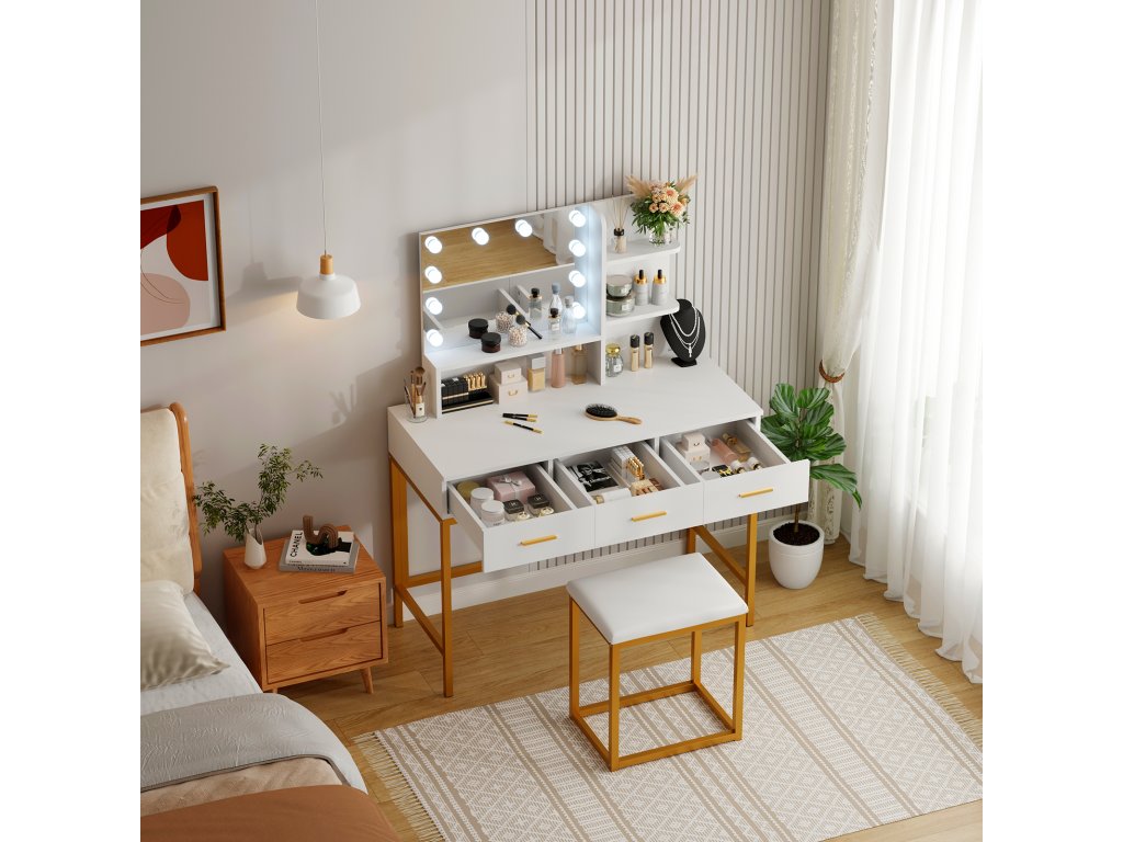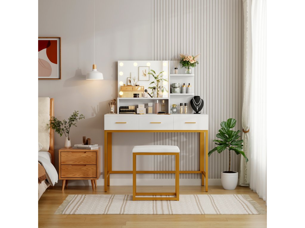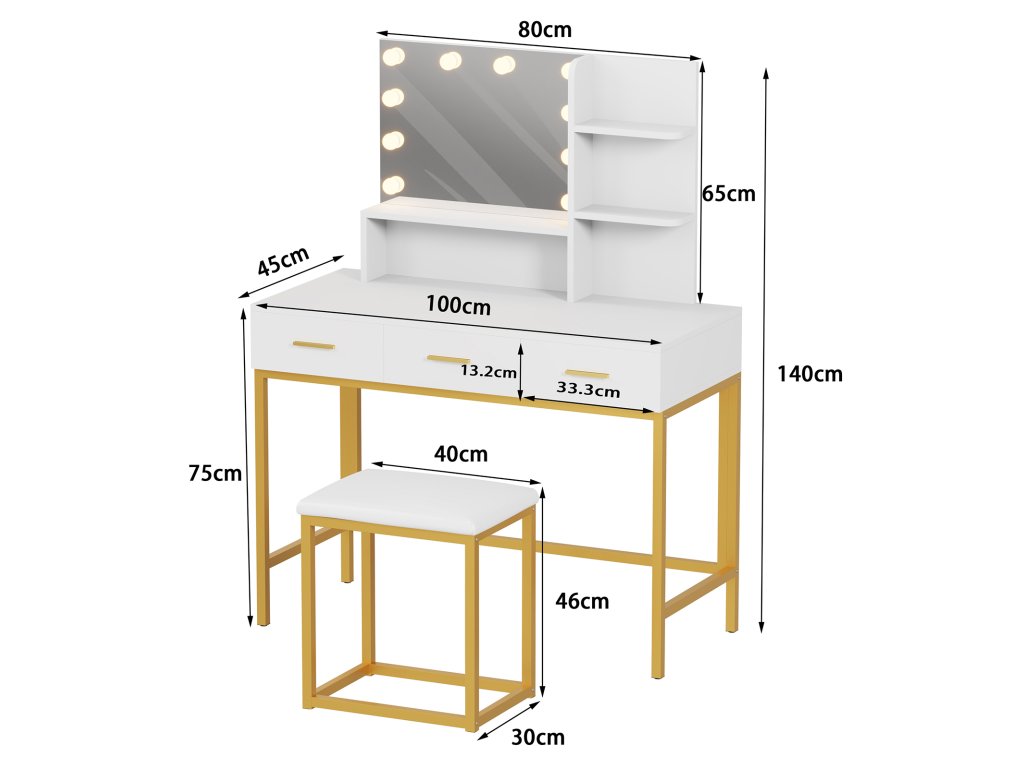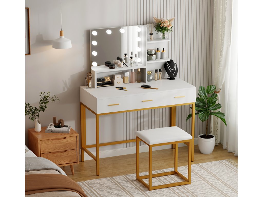 Spojenie elegancie, praktickosti a pohodlia. Tento moderný toaletný stolík s LED zrkadlom a taburetom je navrhnutý tak, aby sa stal neoddeliteľnou súčasťou tvojej spálne či šatníka. Vďaka premyslenému dizajnu ponúka dostatok úložného priestoru, osvetlenie pre dokonalé líčenie a komfort pri každodennom používaní.