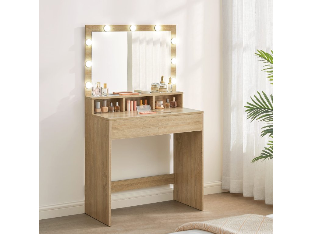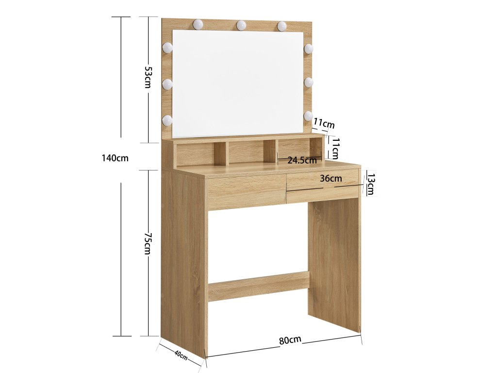 Stabilná konštrukcia, široká pracovná plocha a 2 priestranné zásuvky ti umožnia uložiť všetky tvoje poklady – od dekoratívnej kozmetiky, cez produkty na pleť až po kompletný set na gélové nechty. Veľké zrkadlo ti uľahčí precízne líčenie.