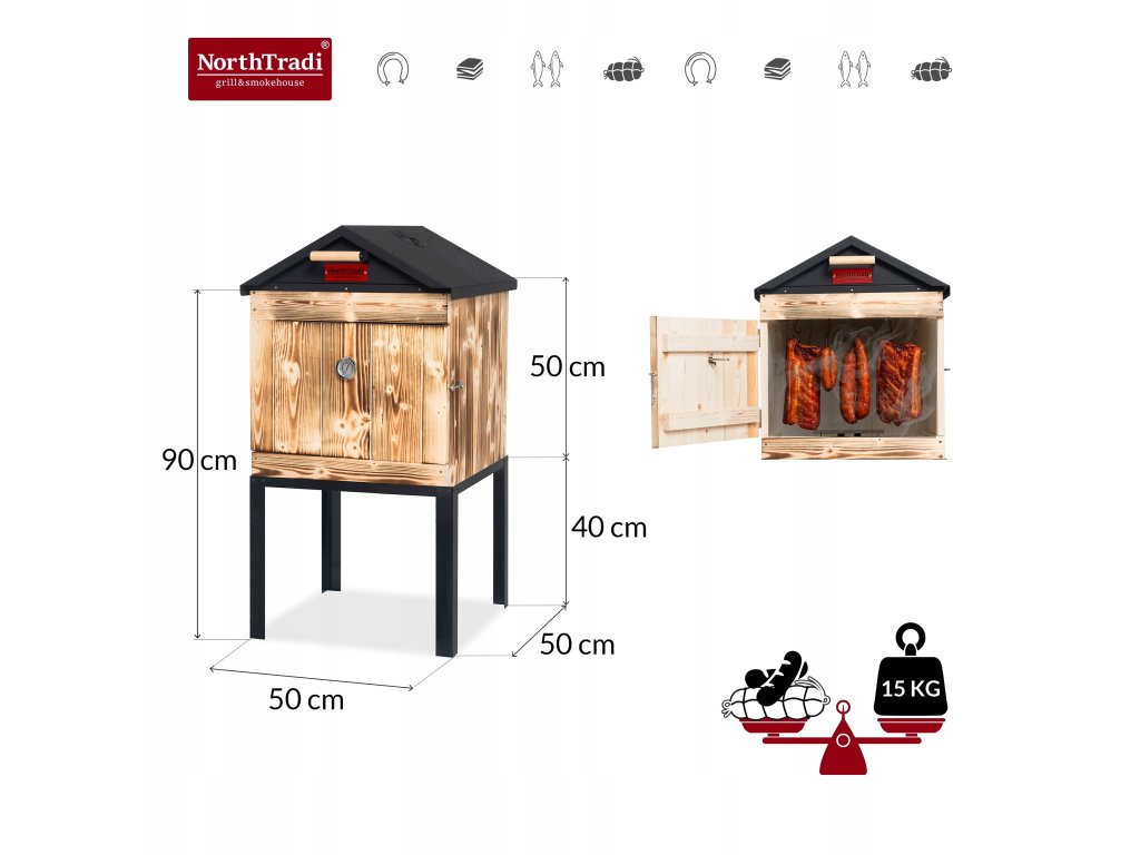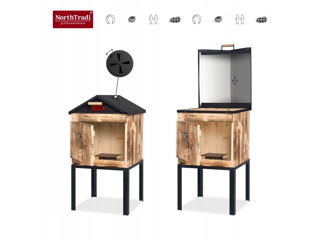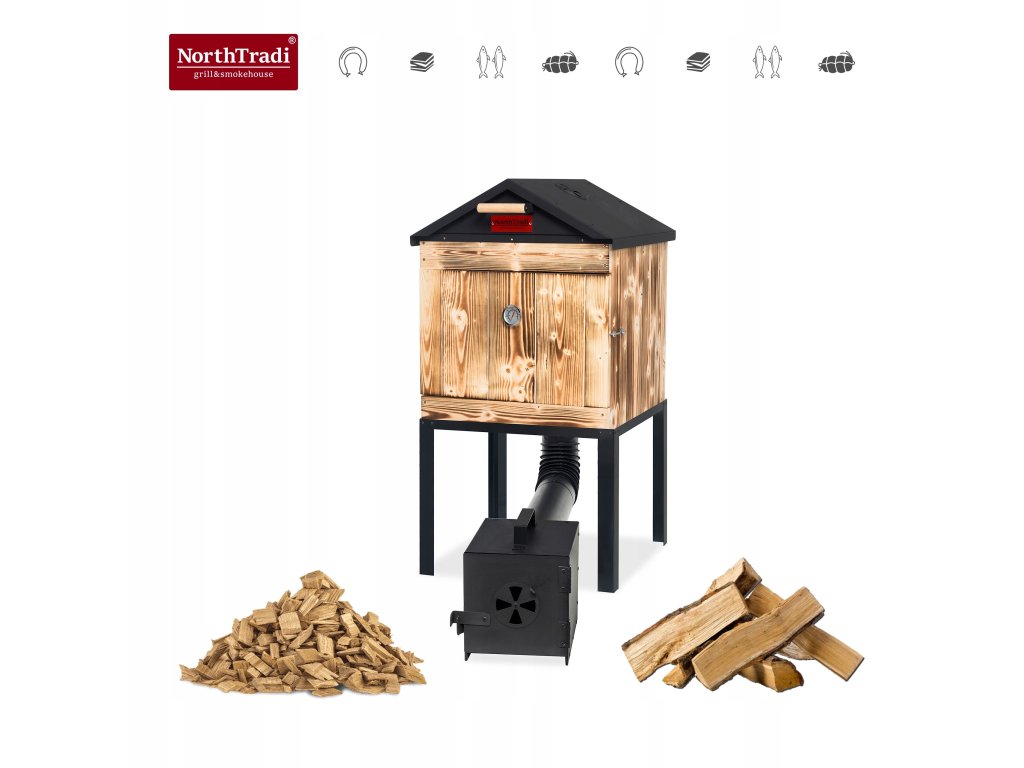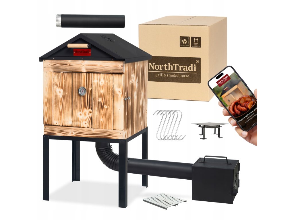 Chcete doma údiť tradične, čisto a s opakovateľným výsledkom? Táto drevená udiareň NorthTradi s kovovou strechou spája komoru zo škandinávskeho smreku s robustným oceľovým páleniskom a premyslenou reguláciou dymu a teploty.