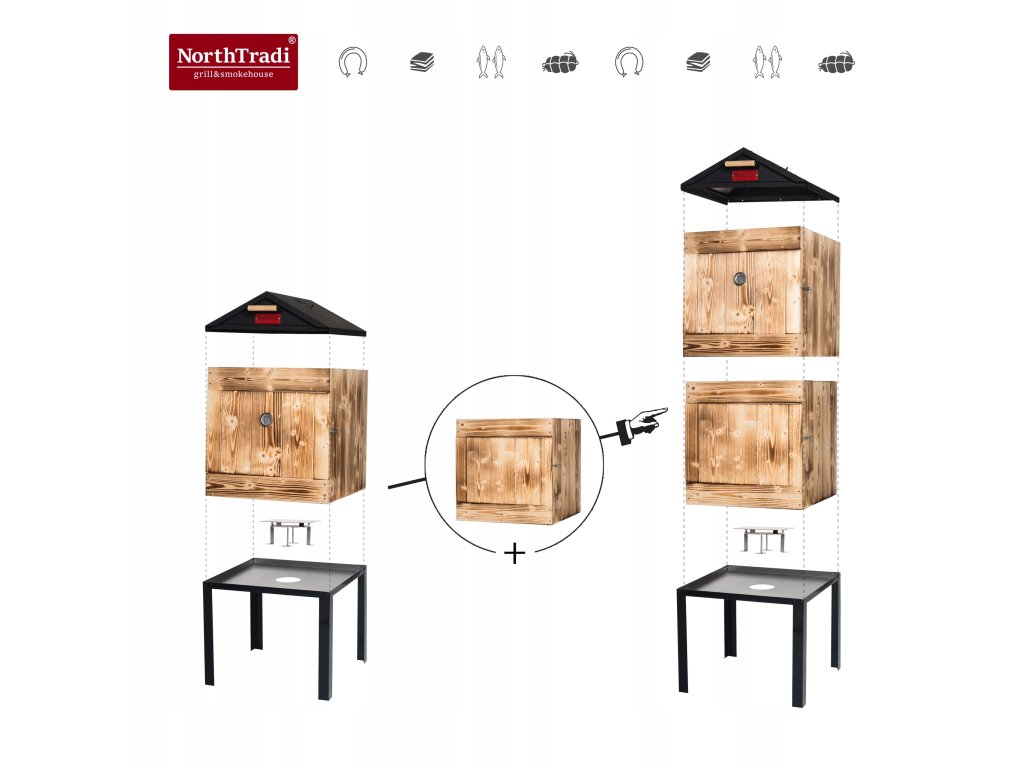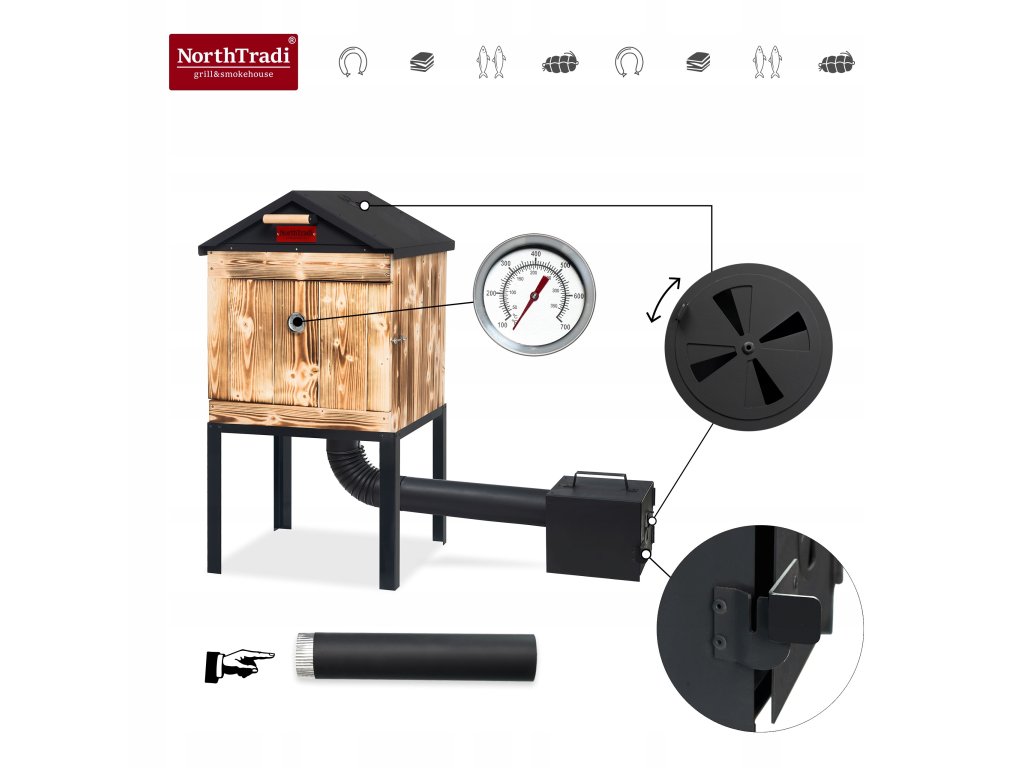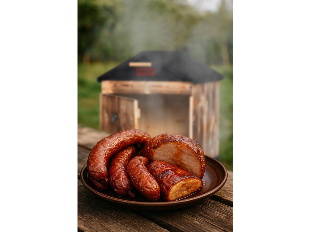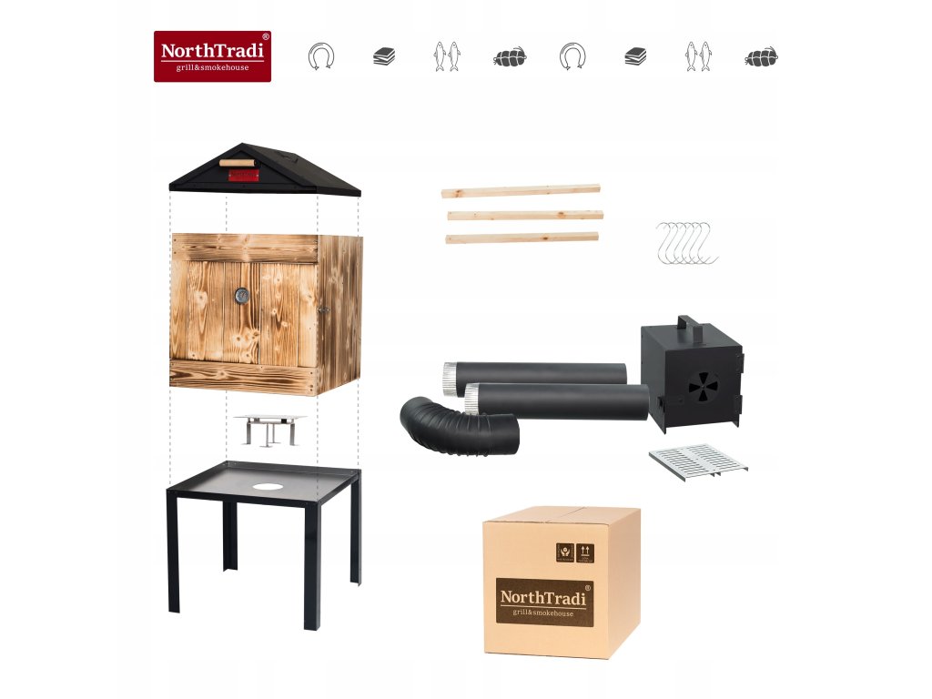 Chcete doma údiť tradične, čisto a s opakovateľným výsledkom? Táto drevená udiareň NorthTradi s kovovou strechou spája komoru zo škandinávskeho smreku s robustným oceľovým páleniskom a premyslenou reguláciou dymu a teploty.