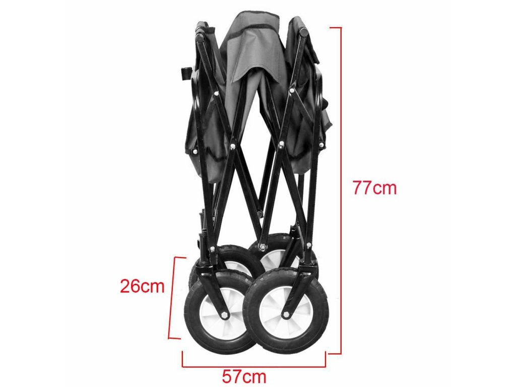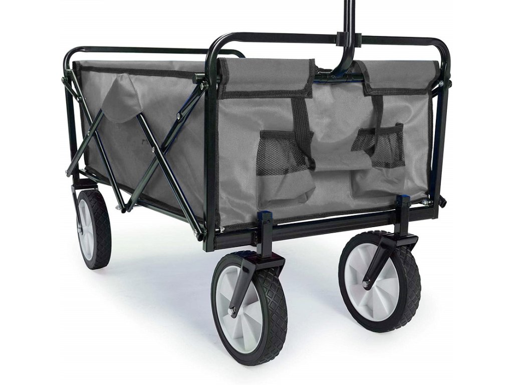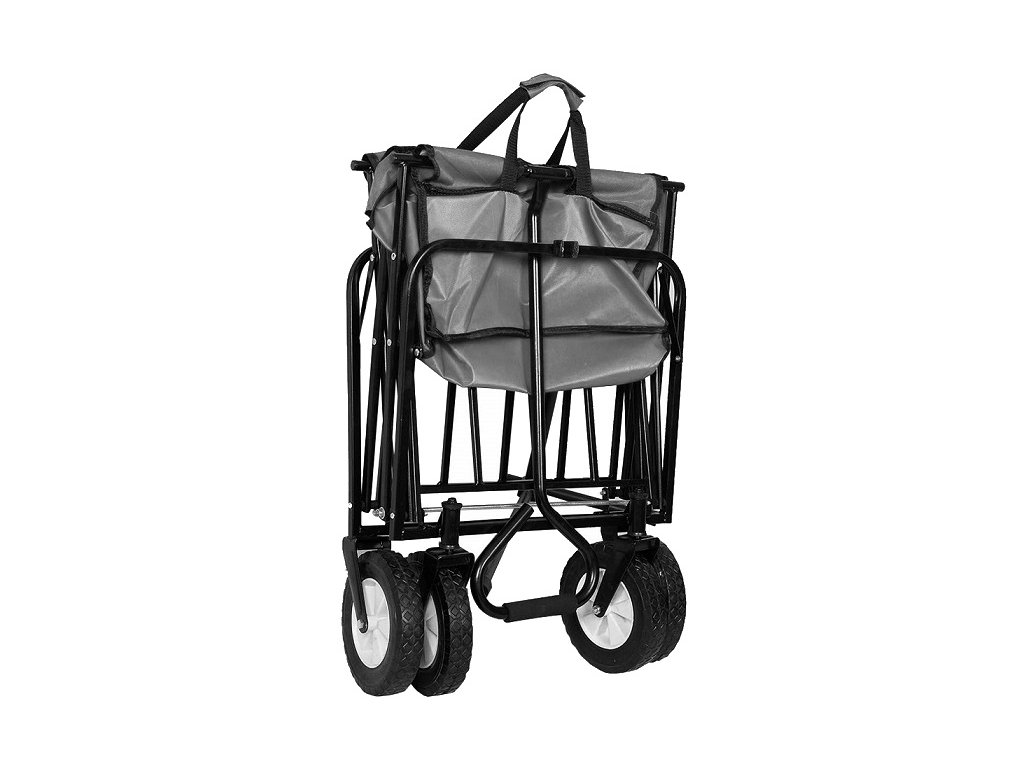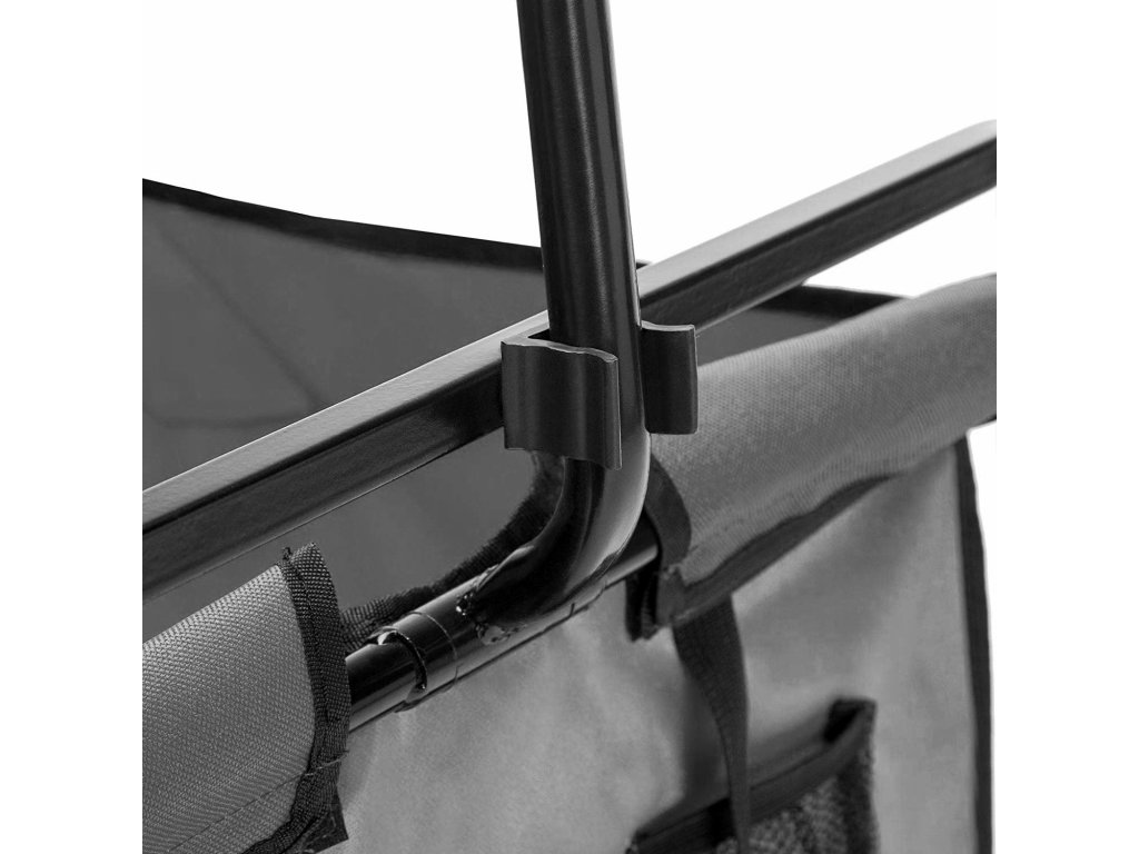 Vozík je navyše vybavený ľahko dostupnými vreckami, napríklad na fľašu s vodou, a po zložení má praktickú rukoväť na pohodlné prenášanie.