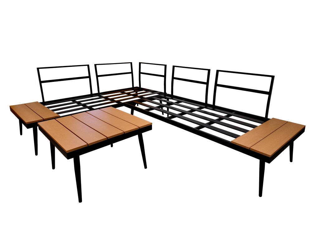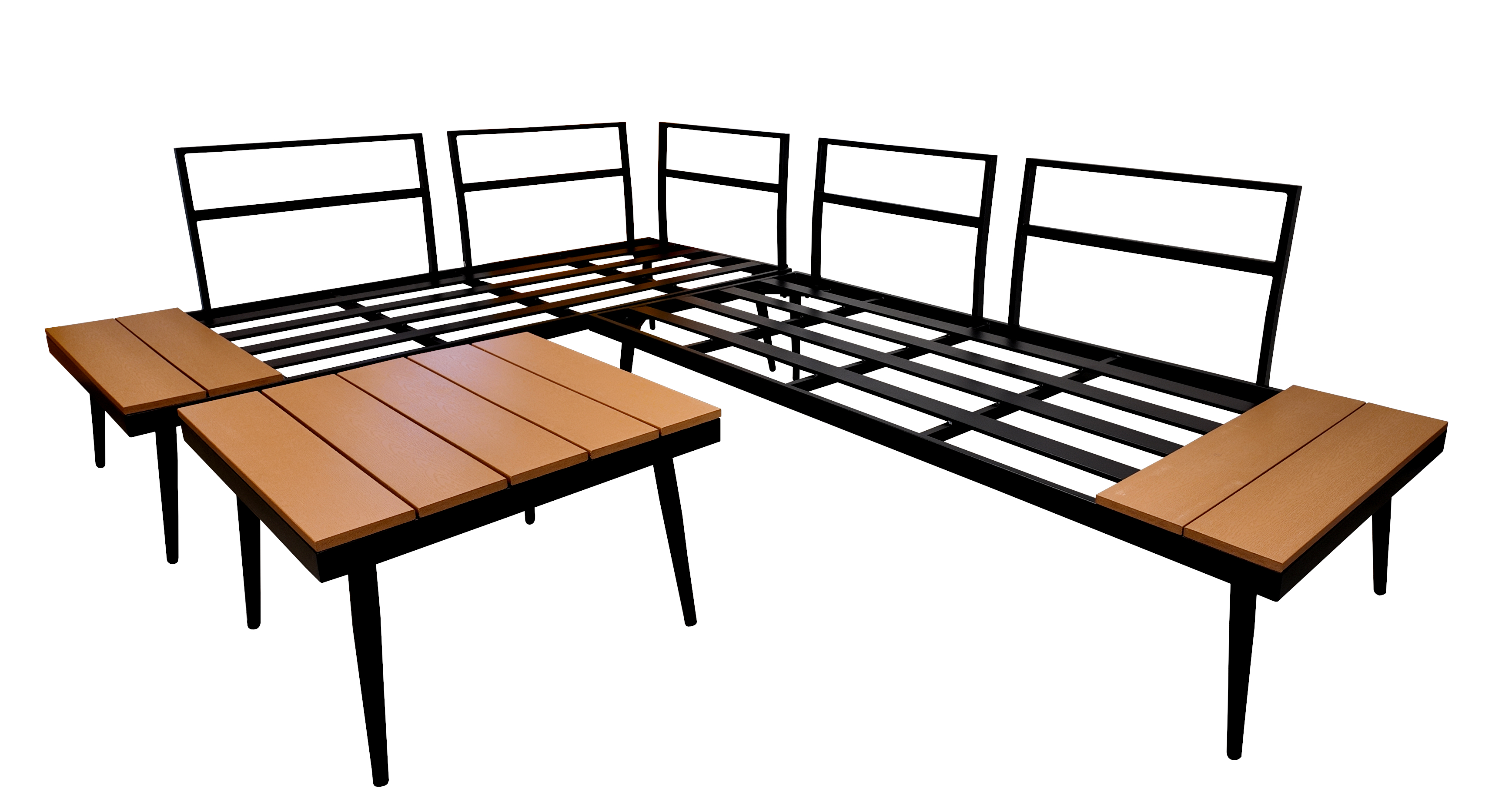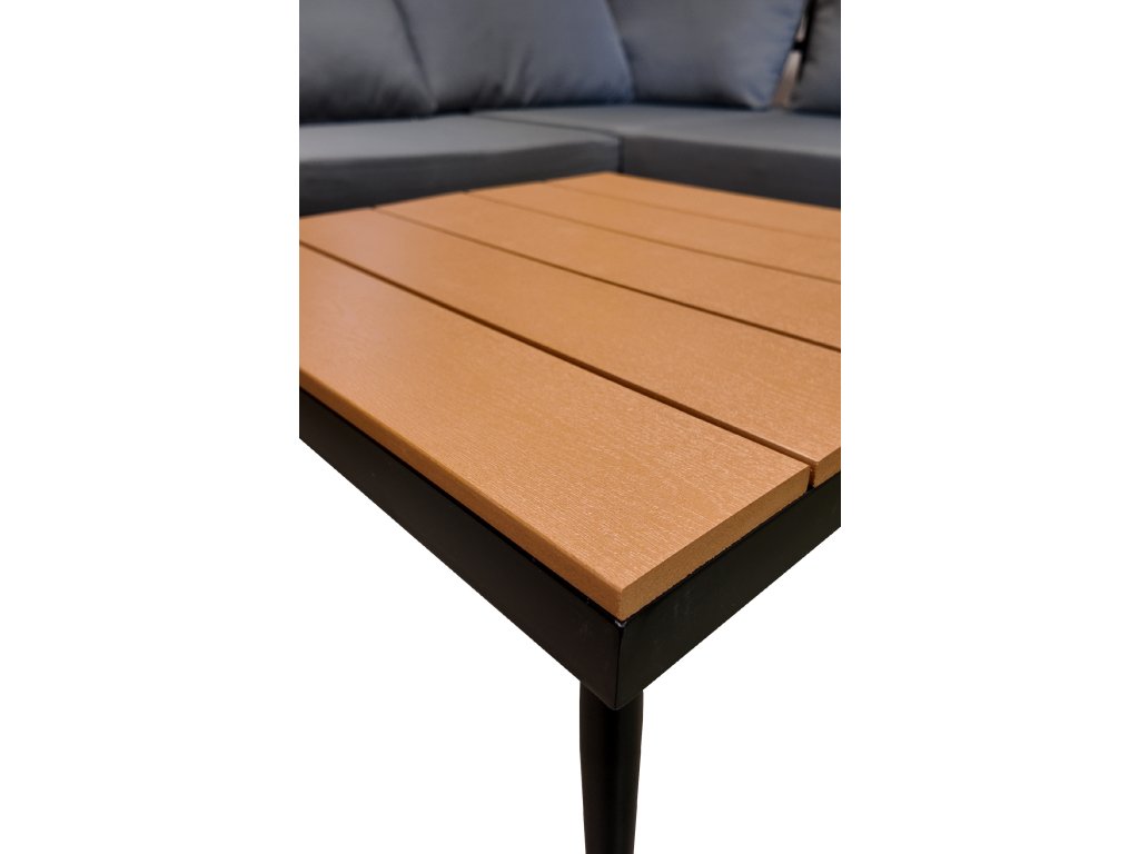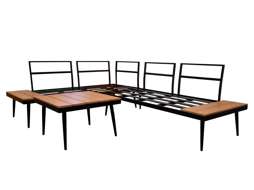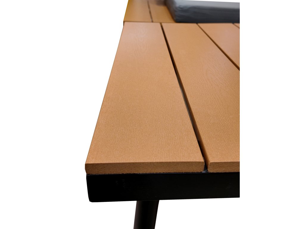 Prírodné drevo dodáva súprave teplo, eleganciu a zároveň slúži ako praktické odkladacie poličky – ideálne na knihy, nápoje či dekorácie.